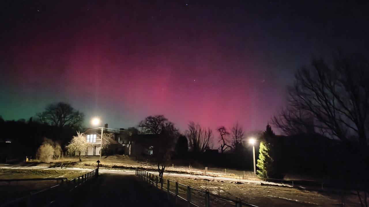 Polární záři nad Markvartovicemi zachytil v noci z 19. na 20. ledna Michal Kapsala Na Hřibovci kolem poldru.